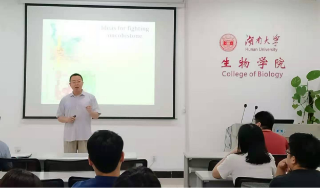 在本次报告中,欧教授就其实验室最新的研究进展,系统的介绍了表观遗传信息调控神经前体细胞分裂和分化中的进展。报告开始,欧教授介绍了组蛋白在生物个体发育中的重要作用,接着介绍其课题组从最新发现的组蛋白在线虫饥饿等应急与胁迫条件下被降解的偶尔发现开始,通过构建一系列绿荧光蛋白标GFP记线虫基因组中各种组蛋白亚基编码基因的基因敲入(knock-in)线虫品系,然后利用EMS诱变开展正向遗传筛选,最后鉴定泛素化酶对H2B蛋白进行特定位点修饰,进而调控组蛋白在饥饿等应急与胁迫条件下的新功能及其分子机制。通过进一步研究,鉴定到胰岛素信号通路参与到组蛋白的降解过程中。欧教授课题组通过大量的正向遗传学筛选、精妙的实验设计和系统的现代生命科学研究技术与方法,为我们呈现了一场精彩的学术报告,内容前沿、演讲精彩,让广大师生了解组蛋白细胞发育中的最新进展及学术成果。欧教授报告结束后,出席学术交流报告的老师和同学与欧教授进行了深入而又热烈的交流与互动。最后,学术交流在一片热烈的掌声中结束。