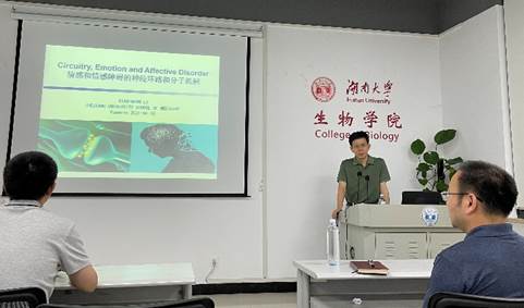 李教授在报告中介绍了其研究团队利用社会压力应激导致的抑郁动物模型中,研究和鉴定了参与抑郁症发病的一条新的神经环路,并发现该环路的突触活动显著增强,利用光遗传技术抑制这条神经环路的活动可以有效缓解抑郁症状。进一步研究发现大麻素受体在这条环路特异性表达,并且在抑郁动物模型中该环路上的大麻素受体表达显著降低。干扰表达该环路上的大麻素受体也可以导致环路突触活动增强和小鼠易感抑郁的表型。李教授研究团队以杏仁核等情感情绪加工的关键脑区为研究对象,通过对这些核团神经元种类,神经环路连接等结构的解析,研究和阐释了其在情感和情感障碍中的作用和机制,发现情感障碍诊治的候选标记物和治疗靶点。李教授的的报告让广大师生了解杏仁核在情感与情感障碍的神经环路机制与分子机制的最新进展及学术成果。出席学术交流报告会的师生与李教授进行了充分交流与讨论。最后,讲座在一片热烈的掌声中圆满结束。