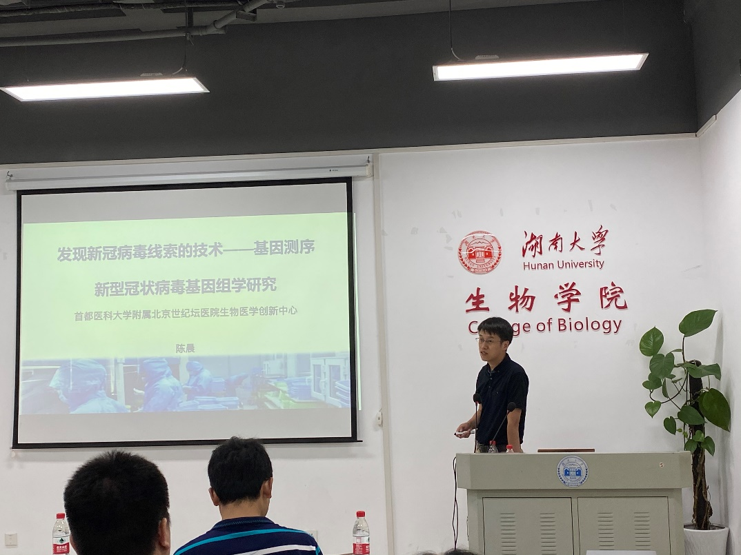 陈晨教授专修细胞遗传专业和计算机软件技术专业,是我国最早的一批生物信息研究人员,进行过基础科研、公共卫生和临床科研等领域的工作,主要研究病原与宿主免疫系统的共进化、基于组学技术的病原与宿主的功能基因组学研究以及细菌关键生物元件在基因组中的水平转移和临床干预。此次报告中,陈晨教授给我们系统而又深入地介绍了最新进展的新型冠状病毒基因组学研究,其主要讲述了基因测序的最新发展进展,以及基因测序技术在发现新冠病毒线索中的最新应用,最主要的成果为MINERVA,该技术是一种灵敏简单新型冠状病毒测序手段,其建立在之前发展的SHERRY方法之上,兼容新冠病人常见的临床样本类型,并通过特异性的富集,来获取高覆盖度和高深度的新冠病毒基因组数据。报告结束后,同学们主要就新型测序技术与历代测序技术的优劣和选择等问题向陈晨教授进行了提问和请教,陈晨教授也给予了自己详细地解答,最后报告在同学们热情的掌声中完满地结束。