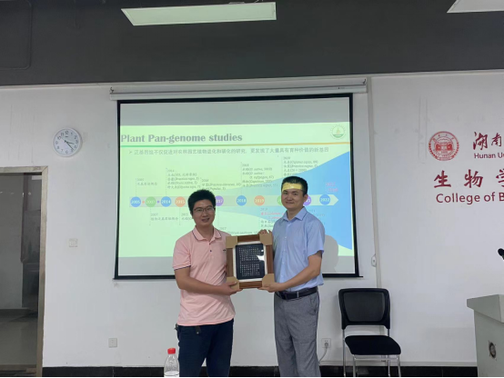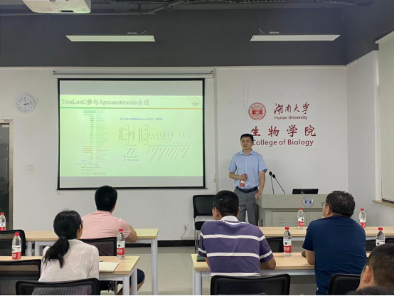 高老师首先从植物系统发育和作物驯化历史、遗传多样性和群体进化规律以及重要性状形成的遗传基础等方面介绍了植物基因组的研究进展。接着,他为在场的师生分享了其课题组相关的研究成果。高老师的科研团队构建了栽培番茄及其近亲的泛基因组,表明了至少部分遗传多样性减少可归因于驯化和改善期间的大量基因损失,并且发现由于现代番茄育种主要集中在产量,保质期和对生物和非生物胁迫的抗性,往往忽略了难以选择的感官/香气质量特性,导致与风味相关的挥发物的减少,其部分原因是TomLoxC启动子的非参考等位基因在驯化期间的强烈负选择。高老师科研团队番茄泛基因组研究工作为番茄基因库添加了近5000个基因,为番茄生物学研究和番茄品质设计育种研究带来了新的机会。