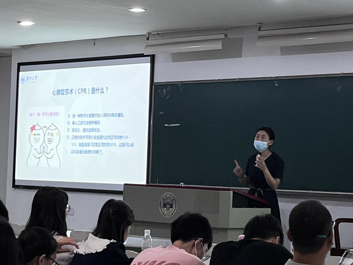 最后,尹老师给同学们普及了急救知识,如心肺复苏的知识讲述和操作要点,提高同学们独立进行心肺复苏的能力。