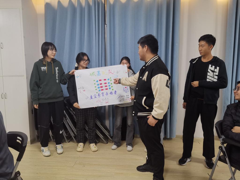 而后,辅导员让大家分成四个小队,分别制作各自的队徽、想好各队的口号、互相了解彼此并筹备上台向大家展示小队的努力成果。大家热情高涨,纷纷投入进任务当中。大家的作品或是注重细节,通过队徽上的种种图案介绍队员们的家乡特色,比如王予含率领的小队就以这种方式介绍了各自的家乡,让同学们印象深刻,也让大家对于本次活动的积极性达到一个新高度。而梁锦程带领的“比奇堡队”却不走寻常路,选择了小组成员共同的童年回忆——派大星作为小组最终的队徽主体,并且将小组各位成员的代表意象融入队徽本身,粗看之下略显潦草,细细品鉴一番后不禁 让人啧啧称奇