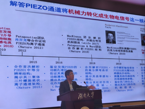 肖教授首先回顾了PIEZO蛋白的发现历程,这是一种能够将物理机械刺激转化为生物电信号的分子受体。2010年,Ardem Patapoutian教授的团队首次报道了PIEZO蛋白,这一发现为我们理解如何感知机械力带来了革命性的进展。肖教授及其团队通过不懈的努力,揭示了PIEZO蛋白如何高效感知机械力,以及它们在触觉、本体觉感知等生理病理功能中的重要作用。