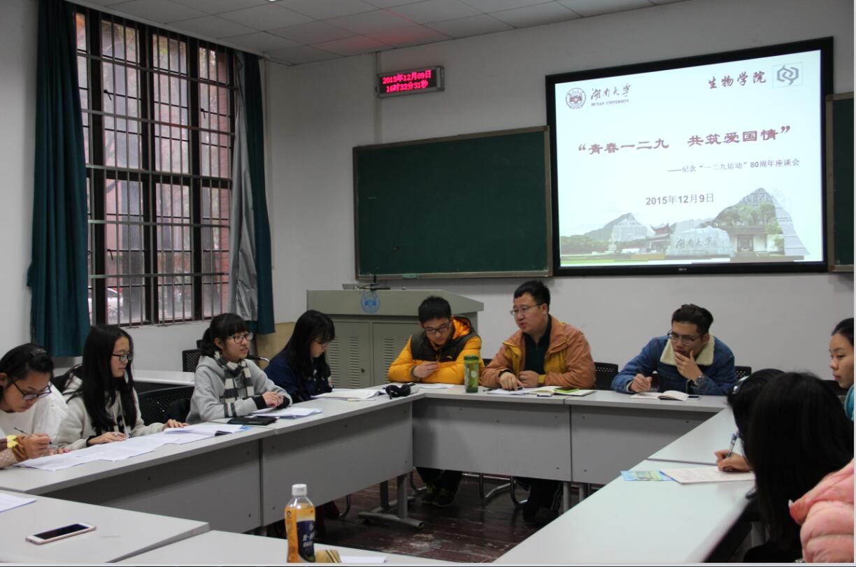 座谈会前,同学们都认真查阅了关于“一二·九”运动的资料,充分了解了“一二·九”运动的历史背景、事件过程和重大意义,主持人何壮首先向大家介绍了座谈会主题,然后简述了“一二·九”运动的经过,让同学们增加了对“一二·九”运动的认识;介绍完毕后,辅导员胡品老师进行了讲话,系统回顾了“一二·九”运动的重大意义,告诫同学们要了解历史,谨记历史,从历史事件中学习前人的精神,并鼓励大家积极参与讨论,积极发表对“一二·九”运动的认识和感想。