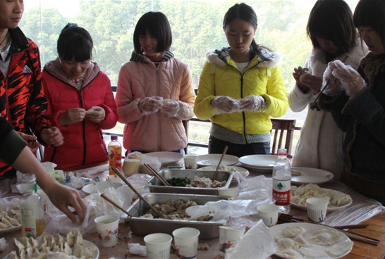 包饺子大赛是一项极富趣味的活动,比赛中同学们以班级为单位分工合作,调味,拌馅,包制,下锅,各步骤进行得有条不紊,一些同学技艺超群,包出的饺子外形精致,堪比那些可以出售的“商业化饺子”,当然还有些同学创意十足,包出了千奇百态的饺子,葵花状,包子状,更有甚者推出了“便便”状的饺子,卖相叫人忍俊不禁。还有一些同学在饺子馅上下功夫,将普通的食材巧妙地搭配在一起,混以各种家常调味料,竟调出了极其特别的味道,可谓“舌尖上的饺子馅”。煮饺子的同学在食堂阿姨的帮助下,有模有样地握着大漏勺捞饺子,腾腾上升的热气混着饺子的香味,再映着同学们的笑脸,场面十分温馨。