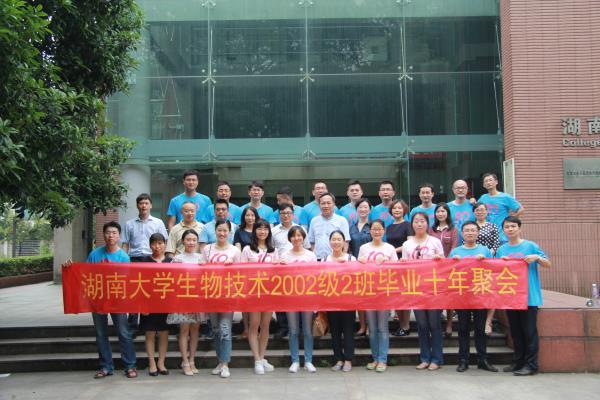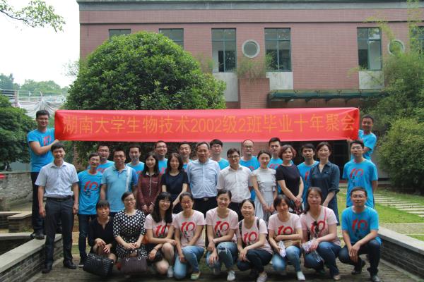 生物技术专业首届(2002级)毕业生回到母校,组织毕业十周年聚会。此次聚会中校友们安排了非常丰富的活动,包括游览岳麓书院、重温校园,参观顶通漫画