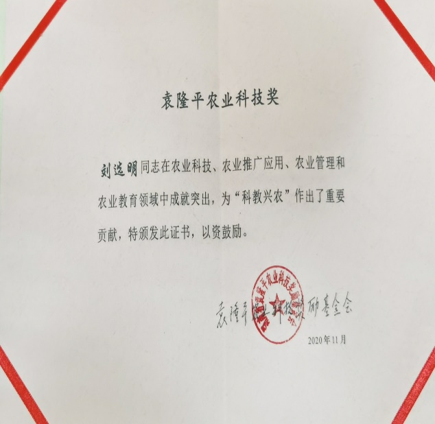 刘选明教授喜获第十一届袁隆平农业科技奖励(创新奖),90岁的袁隆平院士亲自为获奖者颁奖。袁隆平农业科技奖励基金设置主要是在全国奖励在农业科研、农业产业化、农业推广应用、农业管理和农业教育方面做出了突出贡献的先进个人或团体,是全国重要的科技奖励之一,过去已经颁发了十届。