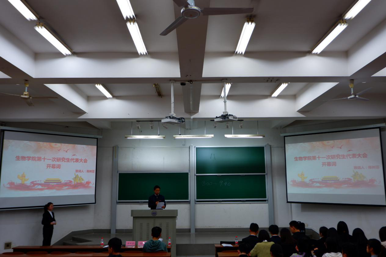 第十一次研究生代表大会筹备工作报告》,表示希望各位代表都能本着严肃、认真、负责的精神参加大会的各项活动。报告完毕后,紧接着就是进行大会的开幕式。在国歌奏唱完毕后,党委副书记陈树芸老师致开幕词,他对第十届研究生会的工作给予了充分肯定,并对参加竞选的同学寄予深切期望,希望研究生会能继续坚持以服务同学为宗旨,以锻炼自己为目标,勇于创新,积极地开展工作。