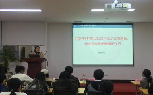 在两位同学的经验分享之后,18级本科生向学长学姐提出问题,他们结合自身经历,逐一耐心地阐述了自己的观点。随后,何晓晓副院长详细介绍了SIT项目、全国挑战杯、创青春、互联网+大学生创新创业大赛、全国大学生生命科学创新创业大赛、全国大学生生物医学工程创新设计竞赛等赛事的具体情况,鼓励同学们积极参与,并于参赛过程中培养创新思维以及合作和实践能力。最后,郭新红主任对本次SIT动员大会做了总结,希望同学们在各大赛事中取得优异成绩。