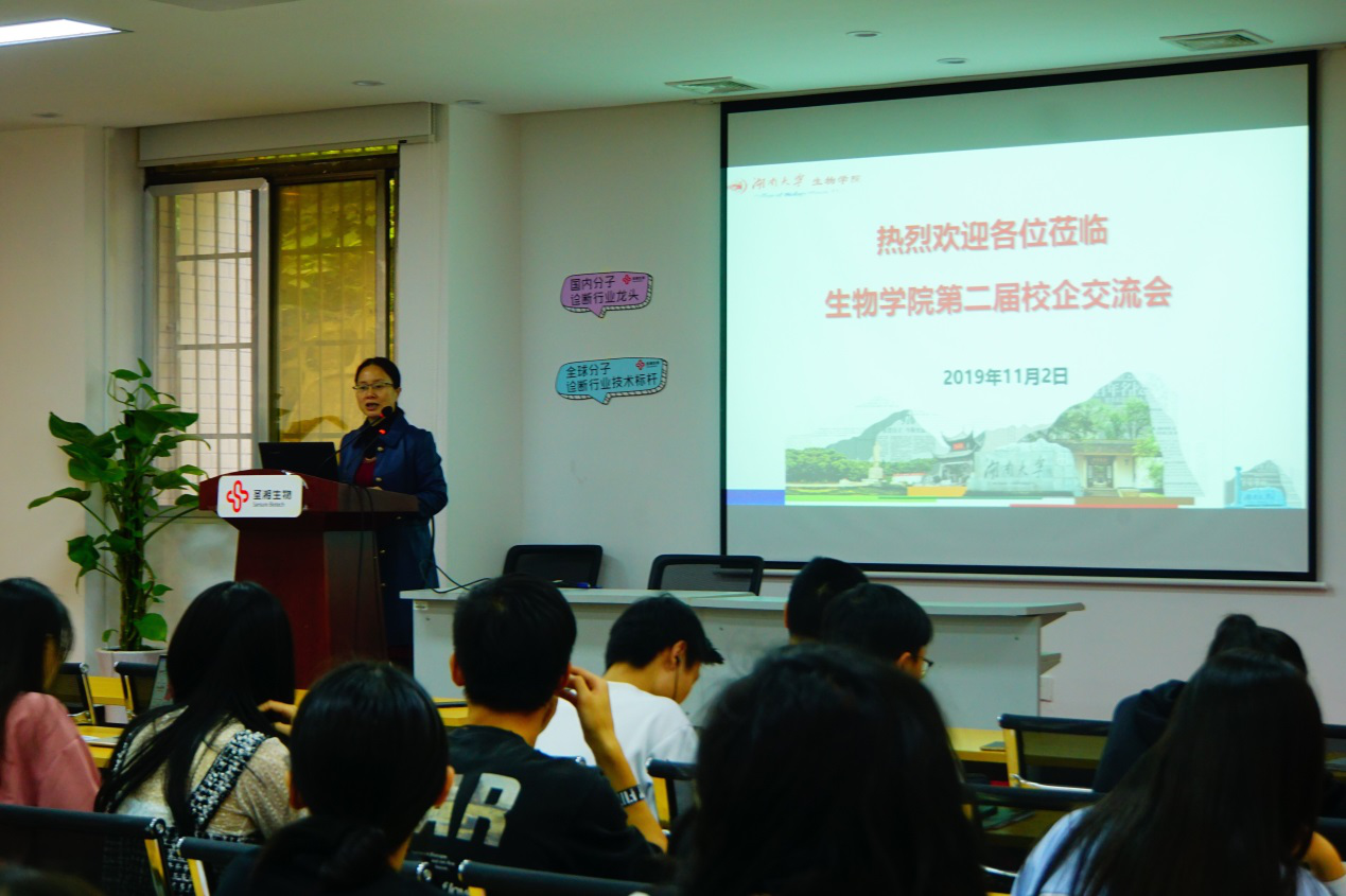 第二届校企交流活动”。参与此次交流会的企业有金域医学检验集团、湖南津湘药业有限公司、湖南圣湘生物科技有限公司以及人和未来生物科技有限公司。学院党委副书记陈树芸、副院长何晓晓、教师代表涂海军、孟祥贤、黄明敏以及在校生与2020届毕业生代表出席本次活动。