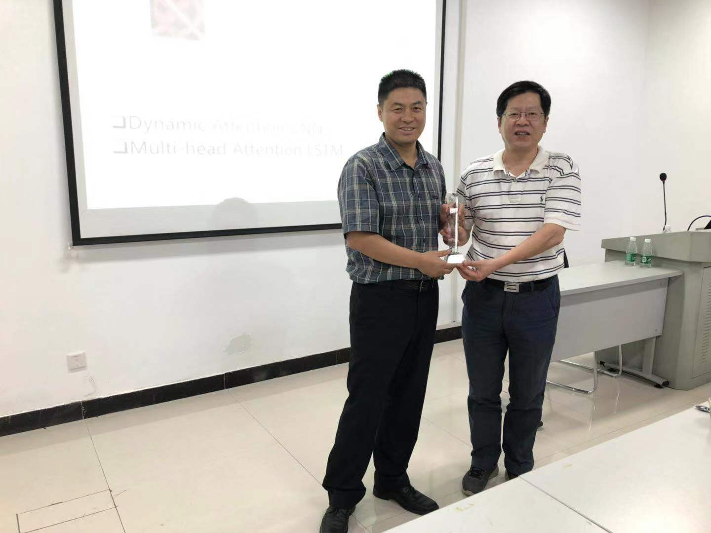 院长谭拥军为杨跃东老师颁发纪念水晶杯并合照留念。本次“天马青年沙龙”论坛分享圆满结束。
