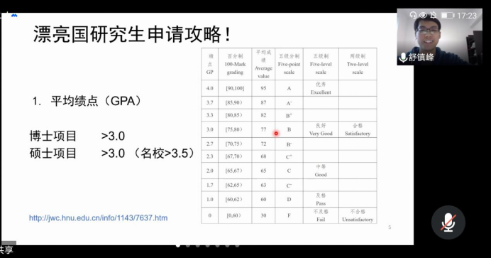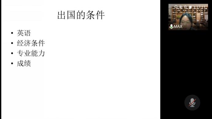 接着,下午5点举办了出国的分享交流会,王钲皓、马湘祺、舒镇峰、刘冠麟四位学长学姐分别从出国前需要考虑的事、出国留学注意事项和出国留学申请攻略等方面向同学们介绍了他们的经历与经验,还指出了在疫情的特殊国际环境下出国留学需要注意哪些问题。同样,学长学姐们在分享结束后回答了同学们关于留学的疑问,并表示非常希望能帮助到更多的同学。