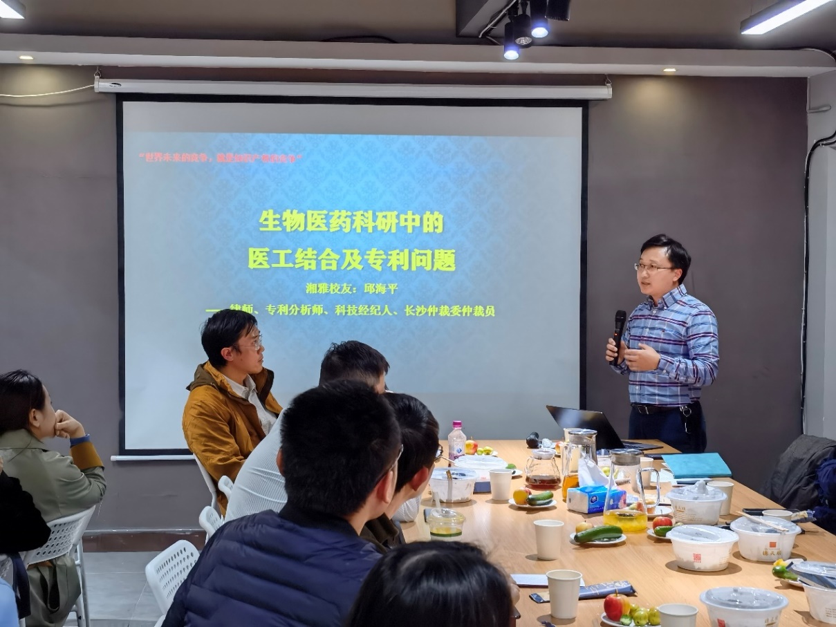 活动伊始,生医支部组织委员赵大鹏同志向来自湘雅系统的医生同志们表示欢迎,并提到习近平总书记在十九届中共中央政治第三十四次集体学习上指出要“把握新一轮科技革命和产业变革新机遇”,要“加强关键核心技术攻关,牵主自主创新这个‘牛鼻子’”,总书记还在多次讲话中强调要“全心全意为人民服务”,生医支部和湘雅系统的同志作为生命科学和医学一线工作者,我们的研究工作事关人民群众的身体健康,我们应牢记总书记嘱托,搞好科研的同时,也要推动成果转化以服务国家、服务人民。专利是科研成果转化中的重要问题,因此本次活动邀请了弘一律师事务所科技法律服务团队的邱海平律师为大家介绍了“生物医药科研中的医工结合及专利问题”,指导大家如何基于科研成果申请转化意义大的高质量专利。邱律师介绍后,中南大学湘雅二医院科研部主任颜苗同志进一步阐述了科研成果转化的重要意义,鼓励大家不要局限于论文、专利本身,要更加重视将科研成果转化为能服务人民群众的发明。之后,生医支部与湘雅系统的同志对于成果转化和科研合作进行了进一步的深入交流,寻找合作契机,互相学习成果转化经验。