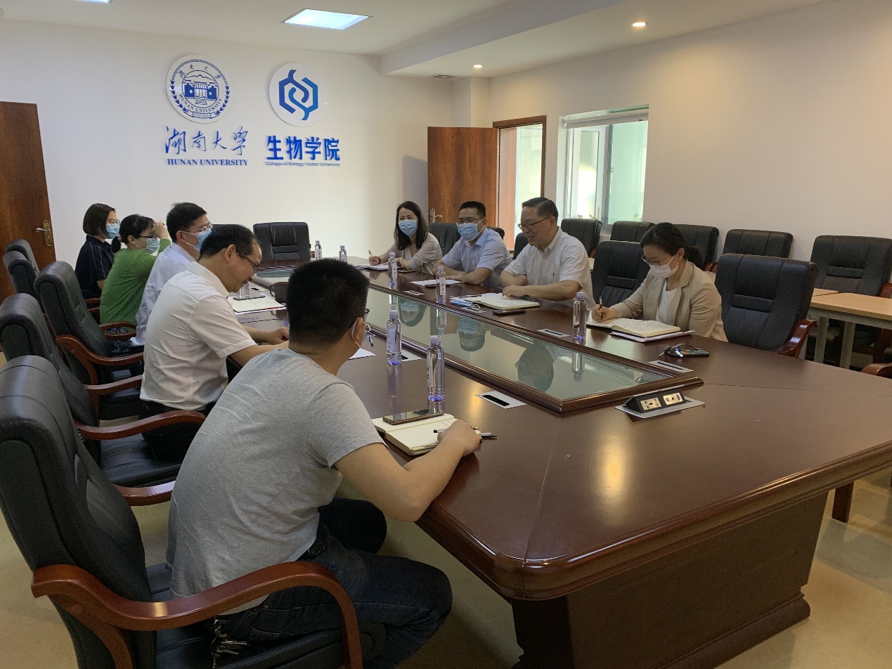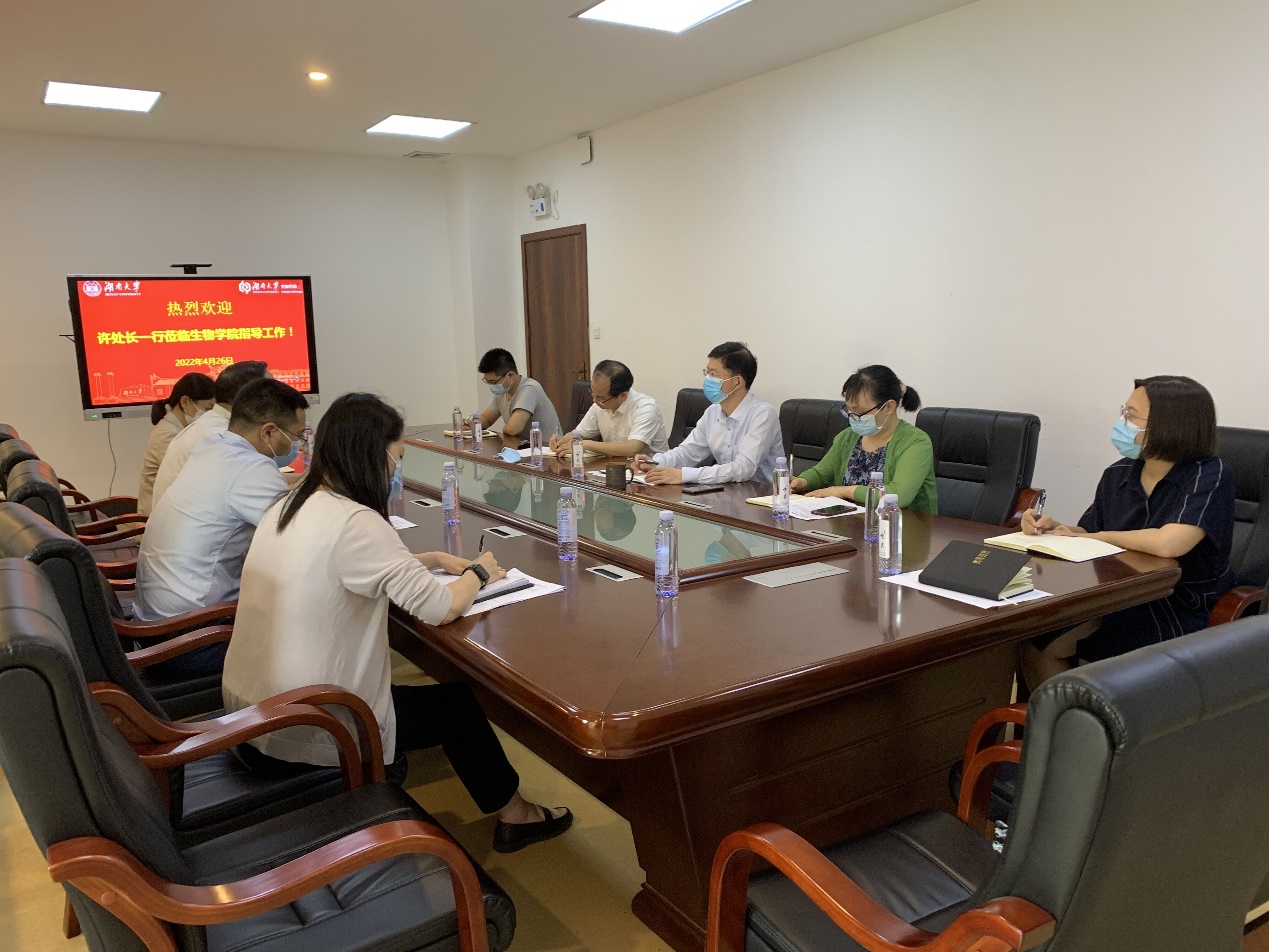 2022年4月26日下午,教务处处长许和连来学院调研并进行期中教学检查,教务处综合管理科长郭兰、教育技术服务中心科长蒋正文和教学评估科李华,学院党委书记李勇军、副院长涂海军、创新创业中心主任郭新红、生命科学系副系主任伍斗生和生物医学系副系主任王奕蓉参加。