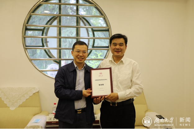 汪卫斌(左)为柏连阳院士(右)颁发铭牌。