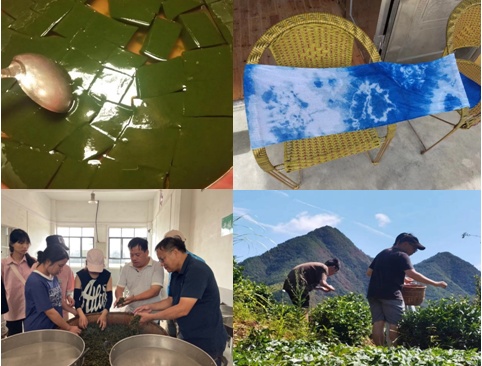 在社会实践环节中,同学们不仅体验了富有地方特色的“神仙豆腐”制作和布料的植物染色;还亲自体验了上茶山、下茶厂,并自己动手完成了采茶制茶工艺。在当地具有三十多年“神仙豆腐”制作经验的阿姨指导下,完成了采摘豆腐柴叶子、清洗干净、揉搓出汁液、滤出上清、滤入草木灰液、静置成型、裁切成块、调味出品等制作流程,实践了“神仙豆腐”从树叶到食品的完整过程。在植物染非遗传承人米兰大姐指导下,完成了将商陆榨汁到布染的过程,体验了植物源染料的神奇妙用。在隆回花瑶云上湘韵食用菌种植专业合作社、湖南虎久雾语茶业有限公司茶厂和茶叶基地,同学们聆听了茶厂董事长谭德友讲述茶叶种植和深加工,并亲自体验了采茶、制茶的过程中,特别是手工制茶“摊青、杀青、揉捻、烘干”等工序,每一道工序都别有一番讲究。