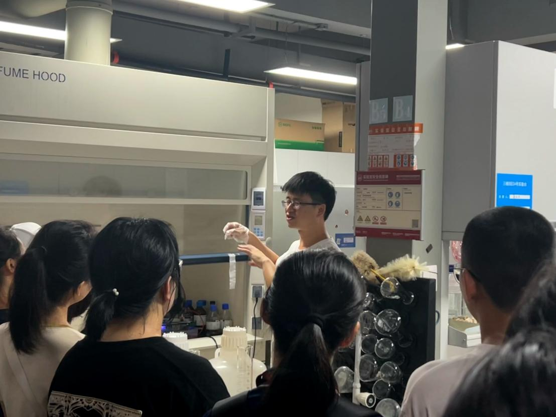 彭天欢老师、李亚超老师带领生物医学工程2301班和2302班开展参观讲解。生医2301班另邀请兼职辅导员邱烨老师为同学们介绍实验楼。邱老师用通俗幽默的语言为同学们介绍了很多实验仪器和基础实验知识,并从生活中大家熟知的果蝇出发,为同学们讲解模式动物及其在实验中的应用。
