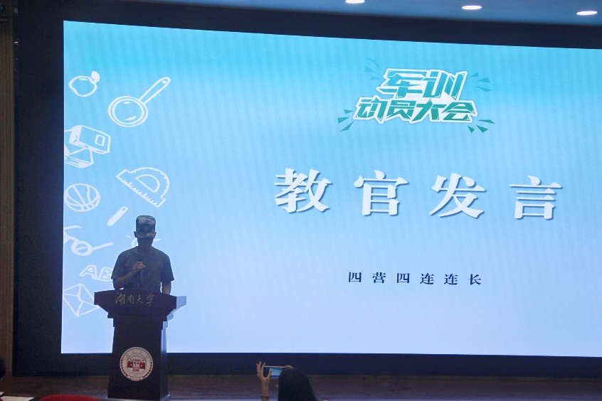 会议第二项,由四营四连连长林教官进行发言,林教官首先祝贺同学们开启大学生活,接着对于军训提出几点要求:遵守纪律、听从指挥,保持良好的军容风纪,按照要求整理内务等,并鼓励同学们放平心态,以积极的心态面对挑战,最后预祝同学们圆满完成军训各项任务。