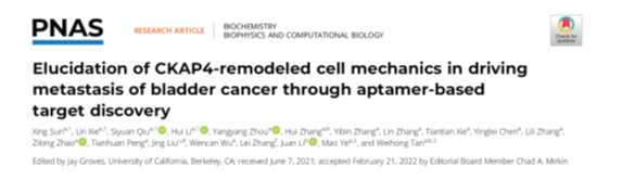 分子科学与生物医学实验室(MBL)的叶茂/谭蔚泓教授团队在《美国科学院院刊》(PNAS)杂志发表题为“Elucidation of CKAP4-remodeled cell mechanics in driving metastasis of bladder cancer through aptamer-based target discovery”的文章。该研究基于课题组在核酸适体研究领域的优势,利用特异性靶向膀胱癌细胞的核酸适体spl3c作为分子工具,发现在膀胱癌细胞中特异性高表达蛋白-CKAP4,明确其作为细胞膜张力调控关键因子,能重塑细胞膜中心-边缘的张力梯度,促进膀胱癌细胞的迁移。同时,还能“搭乘”外泌体实现细胞间的力学信号传递,从而加剧膀胱癌在体内的转移。