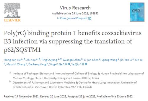 2022年6月26日,该团队与加拿大不列颠哥伦比亚大学杨德成团队合作,在病毒学经典期刊Virus Research上发表了题为“Poly(rC) binding protein 1 benefits coxsackievirus B3 infection via suppressing the translation of p62/SQSTM1”的研究论文,揭示了核酸结合蛋白PCBP1促进肠道病毒CVB3感染的分子机制。