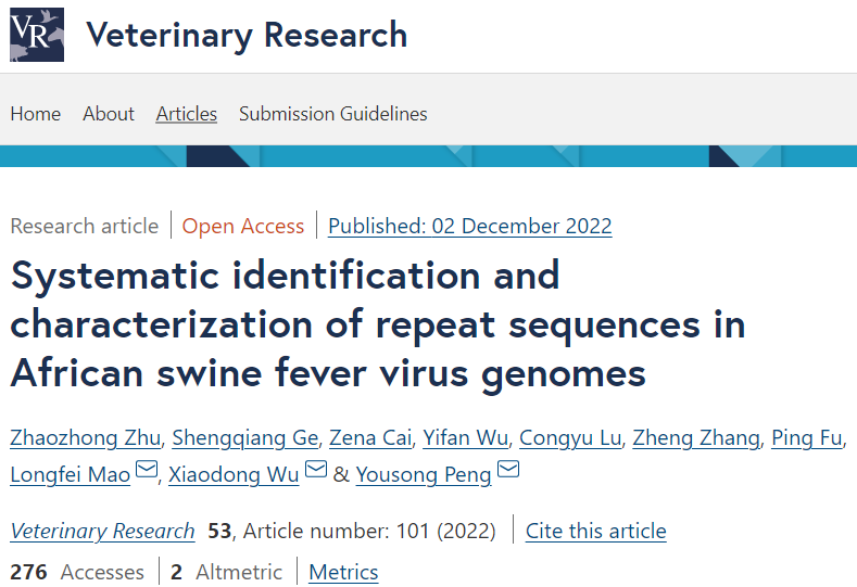 论文4:Zhaozhong Zhu#, Shengqiang Ge#, Zena Cai, Yifan Wu, Congyu Lu, Zheng Zhang, Ping Fu, Longfei Mao*, Xiaodong Wu*,Yousong Peng*. Systematic identification and characterization of repeat sequences in African swine fever virus genomes.Veterinary Research, 2022, 53,101,//doi.org/10.1186/s13567-022-01119-9