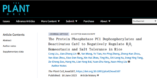 刘选明教授和林建中副教授团队在国际顶尖植物学期刊The Plant Cell在线发表题为“The Protein Phosphatase PC1 Dephosphorylates and Deactivates CatC to Negatively Regulate H2O2Homeostasis and Salt Tolerance in Rice”的研究论文。在该论文中,作者从水稻中鉴定了一个过氧化氢酶C(CatC)的蛋白质磷酸酶,并命名为PC1(Phosphatase of Catalase 1)。作者发现PC1能特异性去磷酸化CatC的Ser-9,促进CatC高活性四聚体解聚为低活性单体,并作为平衡耐盐和生长发育的分子开关而负调控水稻的耐盐性。