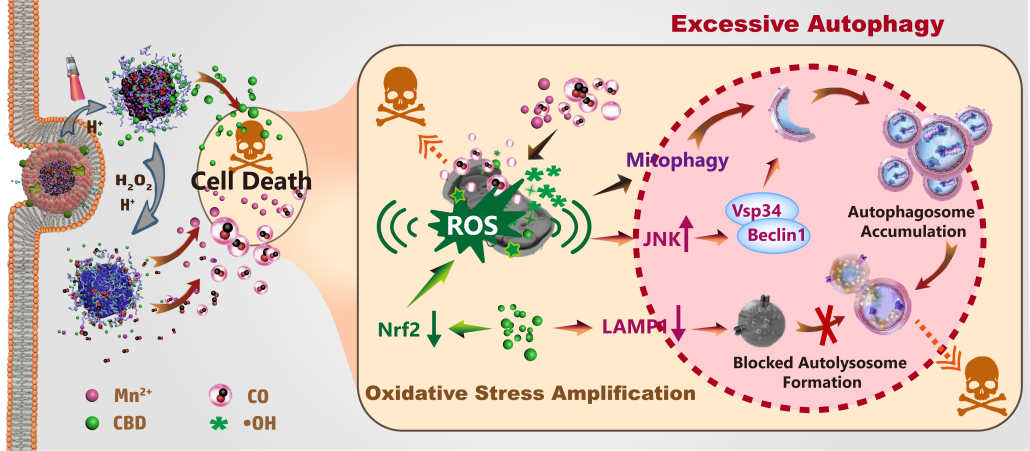 1)发现大麻来源的活性小分子CBD调控TNBC细胞的自噬进程。基于CBD和CO供体构建了仿生CBD协同CO纳米制剂,利用CBD对Nrf2的调控放大CO对线粒体的氧化应激刺激。其次,纳米制剂通过调控ROS/JNK/Beclin1通路和下调LAMP1增强自噬小体的积累和破坏自噬溶酶体的形成,最终导致细胞过度自噬而改善TNBC治疗。相关工作于2023年5月发表于Acta Pharmaceutica Sinica B杂志,论文第一作者为博士生肖畅,通讯作者为顶通漫画