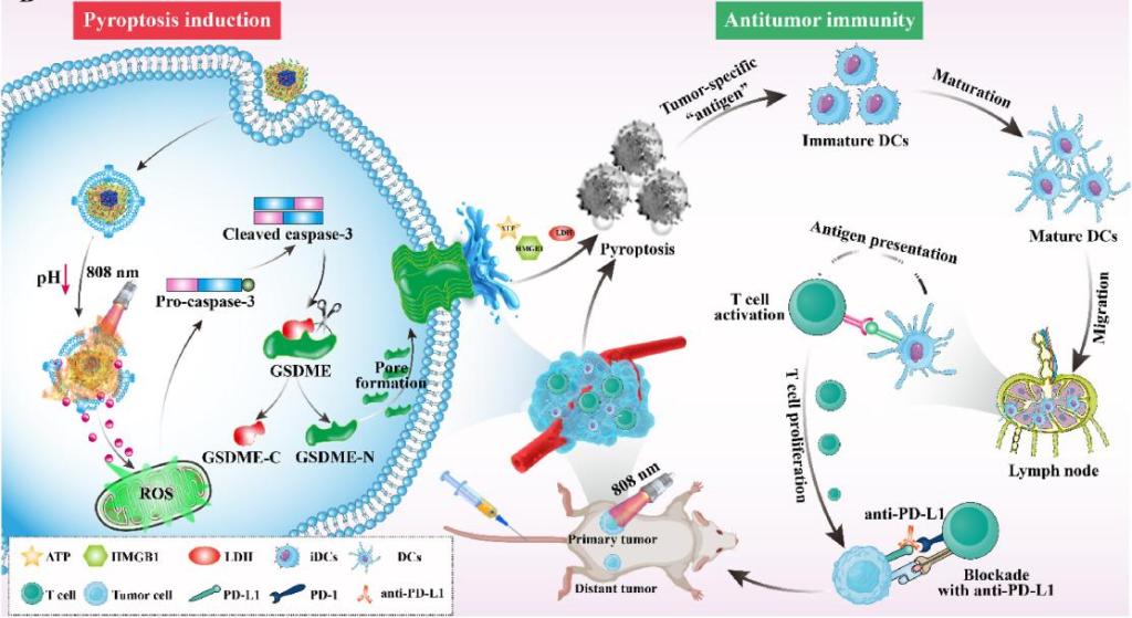 2)蟾酥系列活性小分子CS-1在TNBC细胞中不仅抑制肿瘤细胞增殖和侵袭转移。重要的是,发现CS-1通过Caspase3/ GSDME途径有效杀伤TNBC细胞焦亡。基于CS-1和普鲁士蓝载体构建了CS-1的光响应型仿生普鲁士蓝纳米制剂,光热协同焦亡促进TNBC细胞释放促炎细胞因子和免疫原性成分,导致ICD,促进“热”肿瘤微环境形成。联合PD-L1抑制剂,极大增强TNBC的免疫治疗。相关工作于2023年10月发表于Biomaterials杂志,论文第一作者为助理教授龙樱、博士后范家龙和硕士生周纳多,通讯作者为顶通漫画