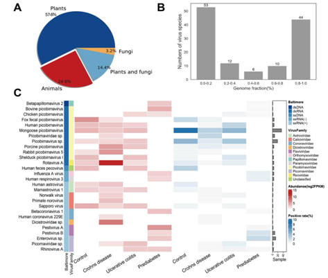 为了说明VIGA在大型数据集上的应用,我们使用VIGA重新分析人类微生物组项目(HMP)的1321个宏转录组样本。我们从467个样本中总共鉴定出125种已知的真核病毒,共组装了44种完整度较高的病毒(基因组完整度>80%),并发现疾病样本中的病毒组组成与健康人的病毒组组成不同。例如,克罗恩病的16种病毒中只有9种在健康人群中也被观察到。而对于每个疾病组,都有一种或多种疾病特异性病毒。例如,此前曾被认为与腹泻等肠道疾病的发生有关的轮状病毒A在克罗恩病患者中的丰度很高,中位数为4837 FPKM。