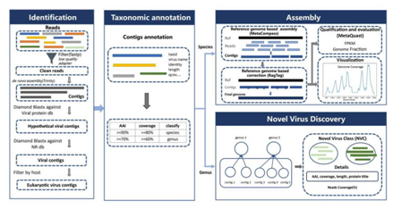 VIGA由四个模块组成,包括病毒鉴定模块(Identification)、分类注释模块(Taxonomic annotation)、组装模块(Assembly)和新病毒发现模块(Novel virus discovery),可在Github上获取(//github.com/viralInformatics/VIGA)。