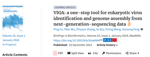 彭友松团队在生物信息学国际权威期刊《Briefings in Bioinformatics》(IF2023=9.5)在线发表题为“VIGA: a one-stop tool for eukaryotic virus identification and genome assembly from next-generation-sequencing data”的研究论文,该研究开发了一种基于宏转录组和宏基因组数据对真核生物病毒基因组序列进行鉴定和组装的生物信息学工具VIGA,为鉴定和表征病毒组提供了帮助。