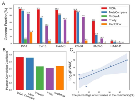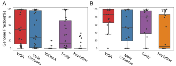 VIGA在甘薯宏转录组数据集上的评估显示,VIGA组装出了10种中的9种病毒,基因组完整度分布在1.5%至100%之间,中位数为47.9%,高于其他软件工具。其中VIGA和MetaCompass成功组装了五种病毒的近乎完整基因组(完整度大于98%),其中三种也被Trinity组装出近完整基因组。在鸟粪宏基因组数据集中,总计有3种病毒的16个病毒株。在大多数样本中,VIGA成功组装了高比例的病毒基因组,中位数为86.54%,只有两个例外未成功组装基因组。