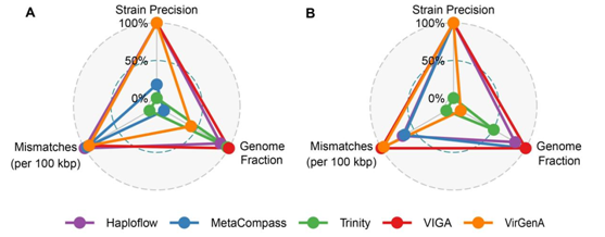 该研究通过三种数据集:模拟病毒群落数据集、真实的宏基因组和宏转录组以及病毒株层次感染数据集,对VIGA的性能进行了深入评估,并将其与两种不同类型的工具进行了比较:基于参考基因组的工具(MetaCompass和VirGenA),以及从头组装的工具(Trinity和Haploflow)。