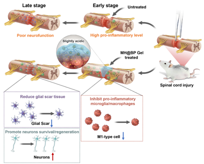 图2:长效抗炎水凝胶抑制脊髓损伤处促炎巨噬细胞、减少胶质瘢痕和增加神经元存活和再生的示意图。