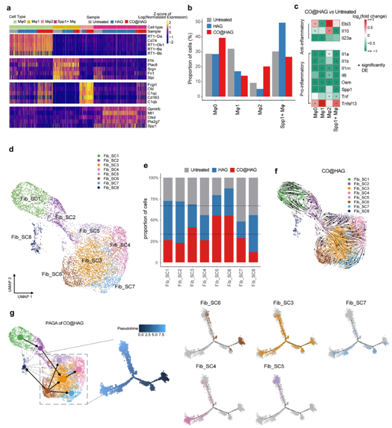 图1:一氧化碳气体释放水凝胶(CO@HAG)治疗后改变创面巨噬细胞炎症特性并促进Fib_SC6(高表达Cxcl14基因)成纤维细胞亚群的聚集。