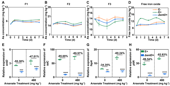 图2. A-D. YG-14和ΔentD对水溶态砷、可交换态砷、非晶体的铁铝结合态砷以及游离氧化铁的影响;E. YG-14和ΔentD在土壤中entD基因的表达量;F. YG-14和ΔentD在土壤中tolC基因的表达量;G. YG-14和ΔentD在土壤中fepA基因的表达量;H. YG-14和ΔentD在土壤中pitA基因的表达量。