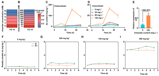 图1. A-B.YG-14对砷酸盐和亚砷酸盐的耐受能力;C-D.不同砷浓度下YG-14对环境中砷酸盐的吸附和吸收能力;E.120mg/L砷酸盐环境下YG-14的pitA基因的表达量;F-I.不同砷酸盐浓度下YG-14对南方红壤中砷的活化能力。