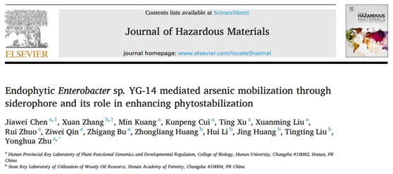 和湖南省林业科学院的最新合作研究成果“EndophyticEnterobactersp. YG-14 mediated arsenic mobilization through siderophore and its role in enhancing phytostabilization”。研究通过构建YG-14铁载体—肠杆菌素合成基因缺失突变体(ΔentD),证实内生菌通过分泌铁载体有效促进了矿物土壤中铁砷络合物的活化,释放可被生物利用的铁和砷到根际中,进一步通过胞外聚合物和特定的磷酸酶转移蛋白PitA吸附和吸收环境中的砷,最终通过定殖的方式将环境中的砷固定在修复植物根部,实现土壤砷污染植物根部固定修复。研究从表型、生理生化和分子水平揭示了内生菌在促进修复植物固定砷和维持宿主植物生长中的重要作用。