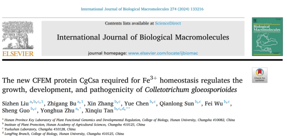 朱咏华教授团队与湖南省植物保护研究所谭新球研究员团队合作在中科院一区TOP期刊International Journal of Biological Macromolecules (IF: 8.2)发表题为“The new CFEM protein CgCsa required for Fe3+ homeostasis regulates the growth, development, and pathogenicity of Colletotrichum gloeosporioides”的研究论文。该研究首次揭示CFEM效应蛋白CgCsa在C. gloeosporioides的致病性、细胞壁和细胞膜的完整性以及生长发育中起着关键作用,并且CFEM效应蛋白能够结合铁,维持C. gloeosporioides的铁稳态,动态调控病原菌生长和致病过程。