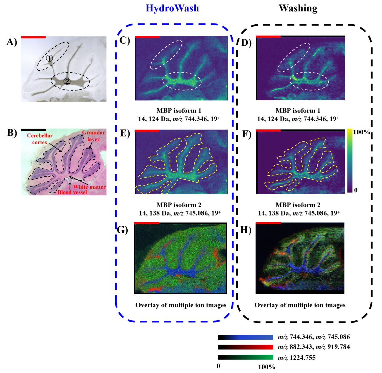 图2 HydroWash策略在小脑组织中的蛋白成像效果,在小脑组织中,HydroWash策略显著增强了髓鞘碱性蛋白(MBP)两个异构体的质谱信号,配合40 μm空间分辨率,实现了真实、清晰且准确的蛋白空间分布成像。
