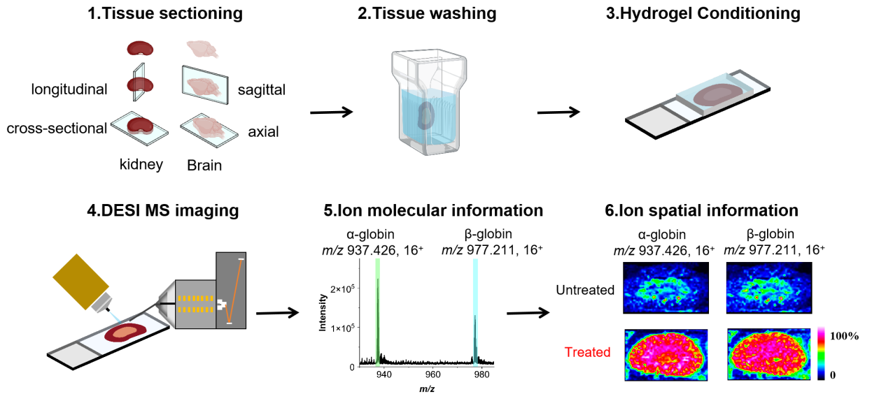 为应对这一挑战,岳磊教授团队创新性地提出了组织蛋白质成像新策略:HydroWash。该方法创新性地将组织洗涤与明胶水凝胶调控相结合,协同增强蛋白的溶解性与离子化效率,从而在DESI-MSI中实现了蛋白质成像灵敏度与空间分辨率的双重提升。