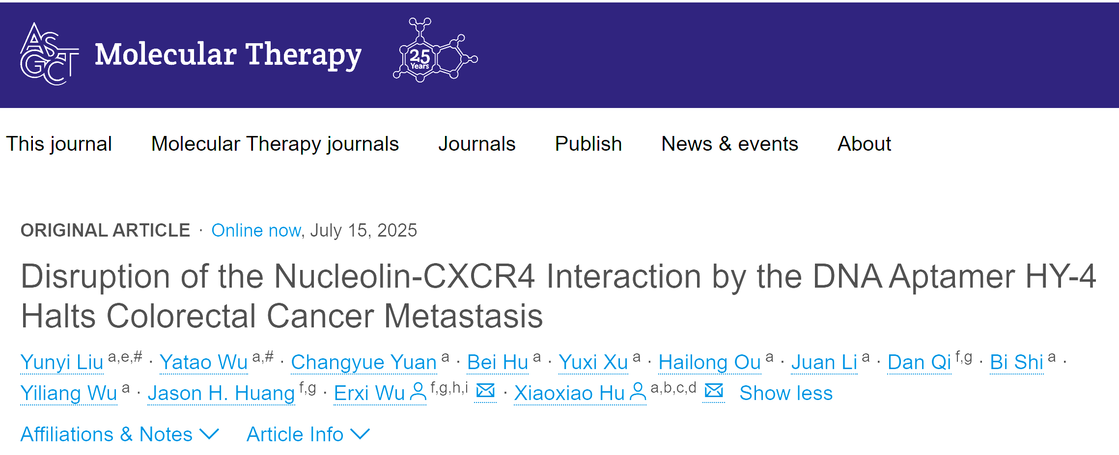 胡小晓副教授、美国贝勒医学院的吴二喜教授为文章的共同通讯作者。原文链接://doi.org/10.1016/j.ymthe.2025.07.002