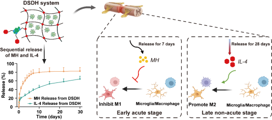 针对上述挑战,施李杨教授团队创新性地构建了一种基于水凝胶的双药序贯释放体系,通过程序化调控药物释放,实现对小胶质细胞/巨噬细胞M1/M2极化的精准时序调节。该体系以透明质酸(HA)水凝胶为骨架,集成两种不同释放机制:在脊髓损伤急性期,利用负载于纳米颗粒中的盐酸米诺环素(Minocycline Hydrochloride, MH)快速释放以抑制M1型促炎反应;在慢性期,则通过生物素–链霉亲和素(Biotin–Streptavidin)相互作用实现白细胞介素-4(Interleukin-4, IL-4)的持续缓释,诱导M2型抗炎表型形成,从而系统性地重塑损伤区域的免疫微环境。